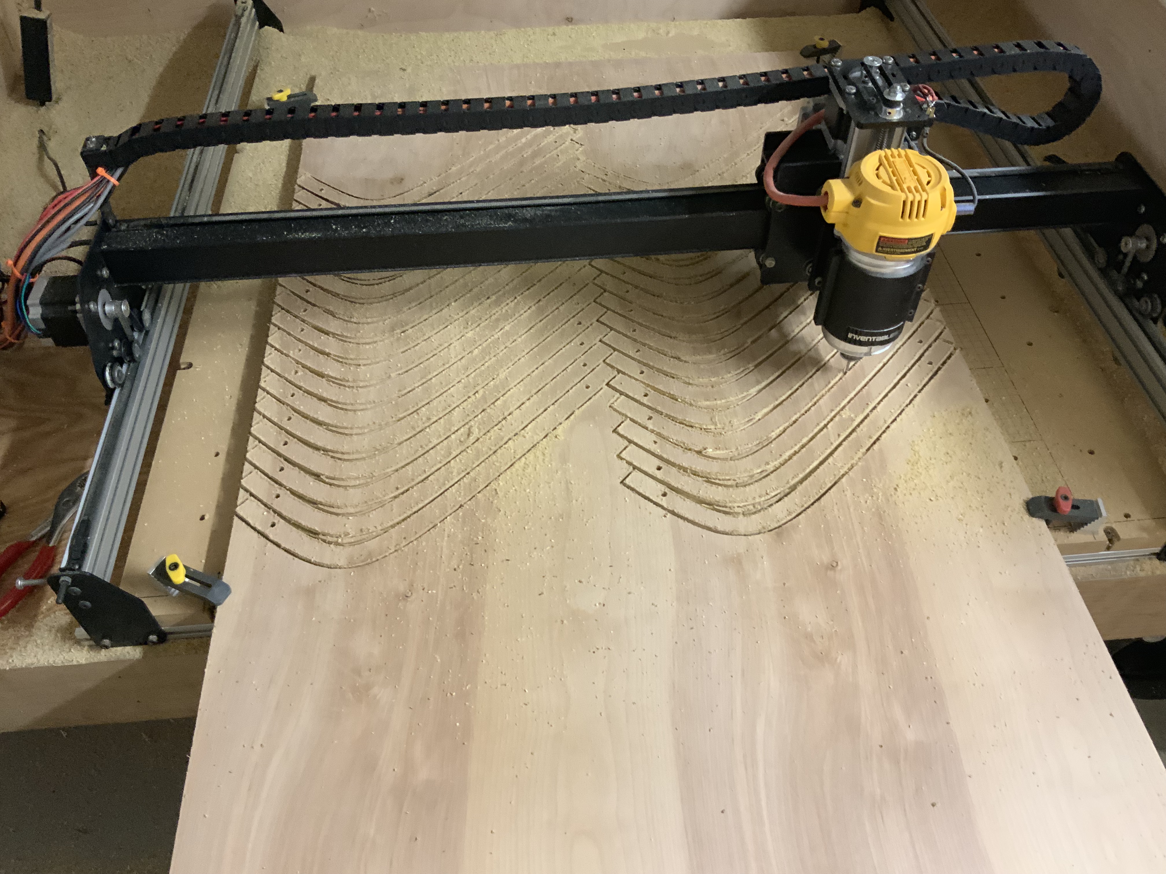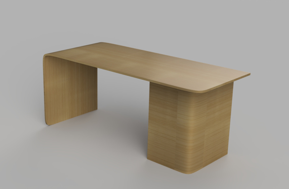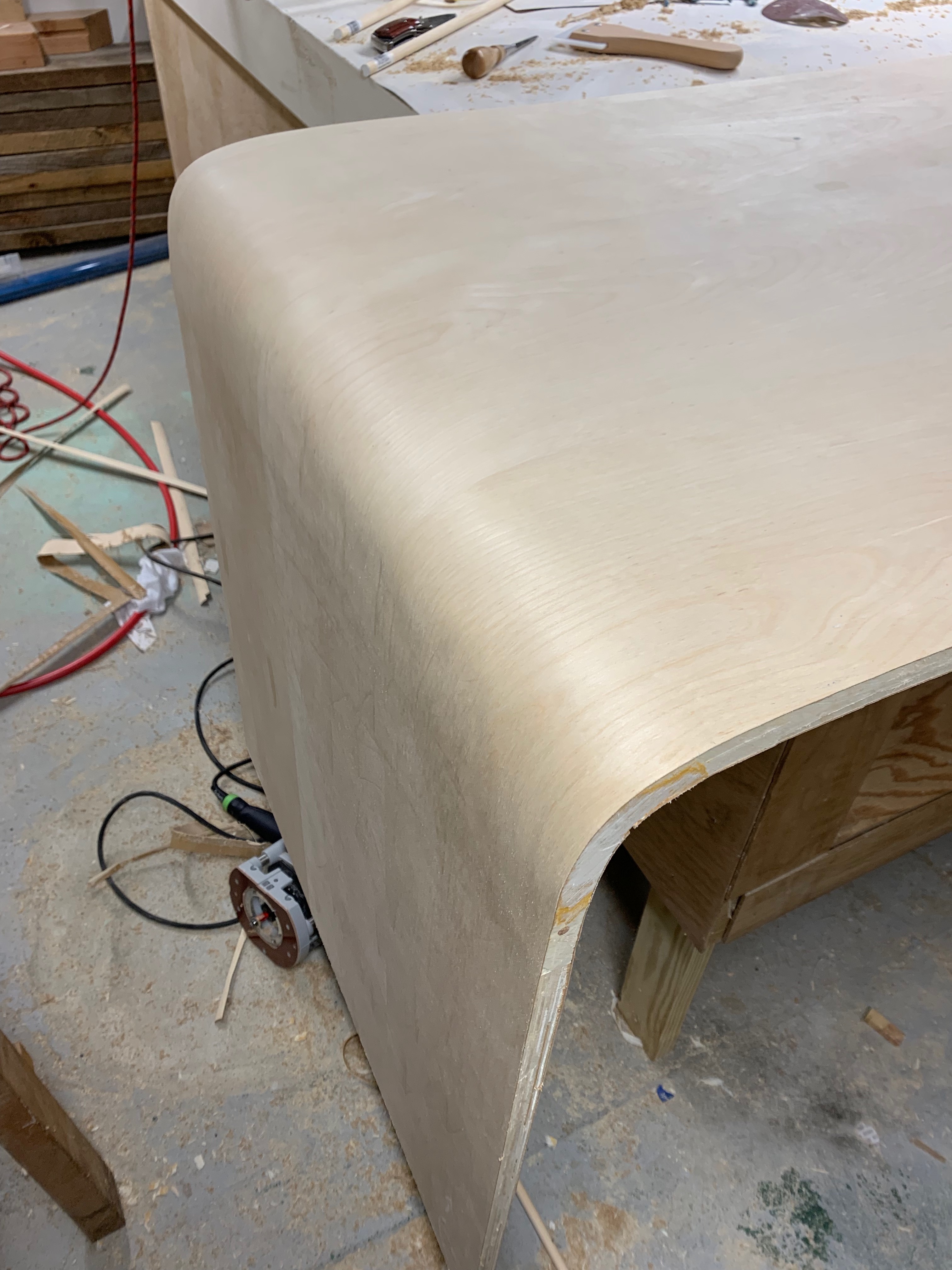 As usual, these design choices were simple on paper; however, in reality they created tremendous construction challenges. The most challenging element was the curve of the top surface as it dropped down to become a leg of the desk. Wood does not naturally bend into such a shape, and the leg had to be structurally supportive. I achieved the shape and the strength of this curve by cutting the profile of the curve out of three quarter inch plywood on a CNC machine. I made about forty curve shapes and then laminated them together. This curve was then joined to two ordinary sheets of plywood to create the main piece of the desk. Finally, I wrapped the desk in a real birch veneer to simulate the look and feel of solid wood. This veneer work posed its own challenges. The veneer must be bonded to the plywood with an industrial contact cement. There was no room for error because once the veneer and the wood touch, they are permanently bonded. I used a technique used for laminate counter tops where the veneer is suspended above the piece on dowels. The dowels were removed one at a time to allow control over the bond process.
