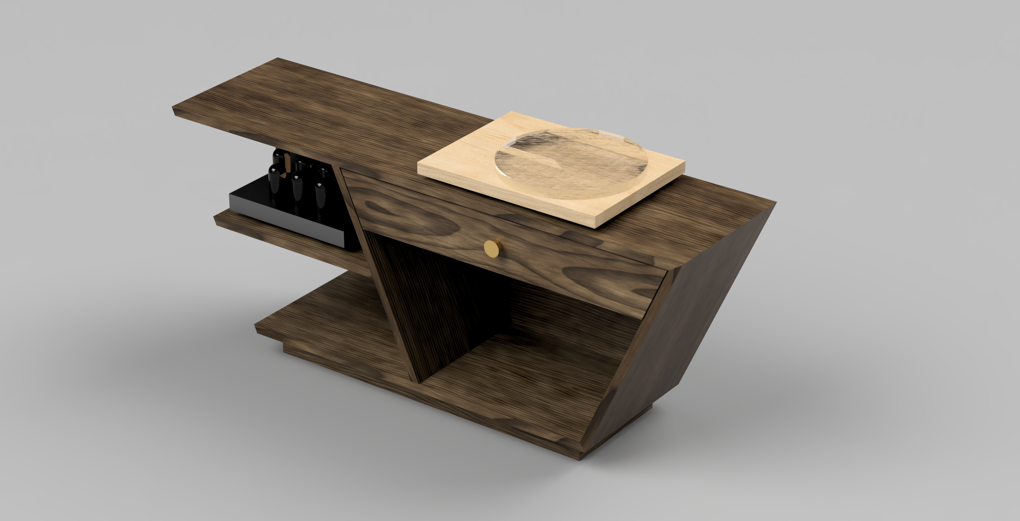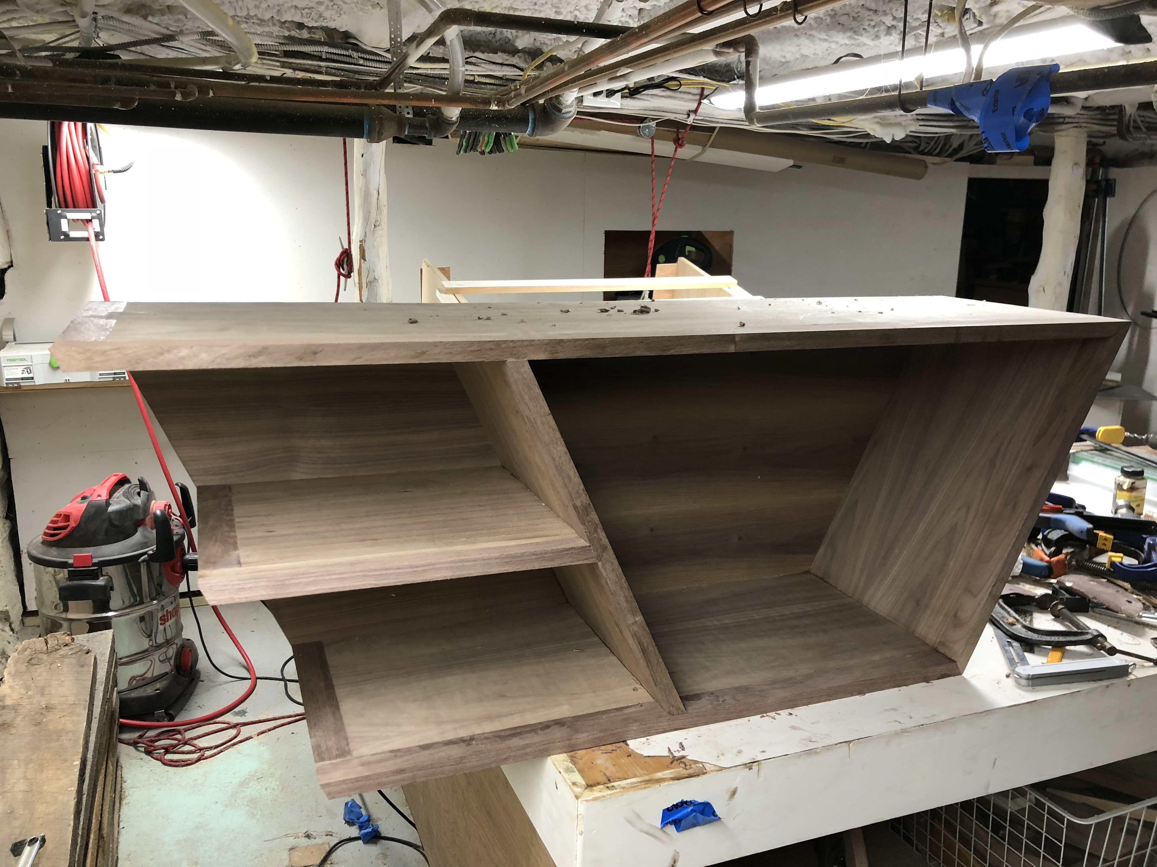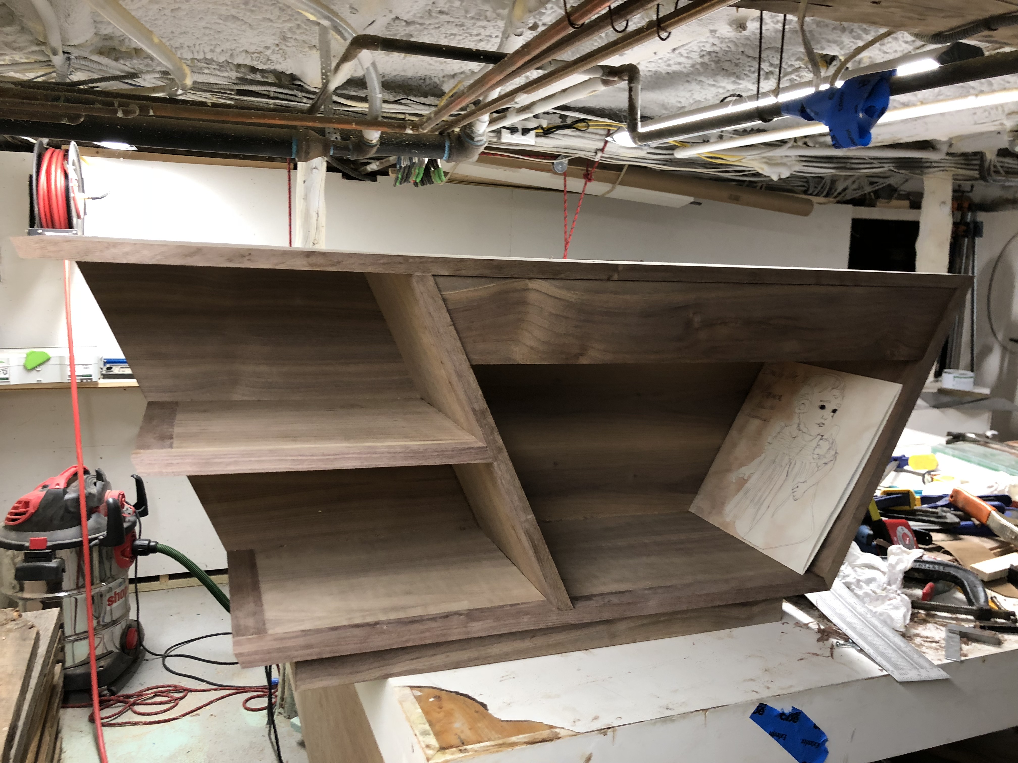 From these models, I began building the piece. It was constructed of walnut veneered plywood and finished with a face frame that covers the raw edges. The most technically difficult aspects of this construction were the multiple angle cuts (or miters) required to achieve the trapezoid shape. Many of these cuts took multiple attempts.