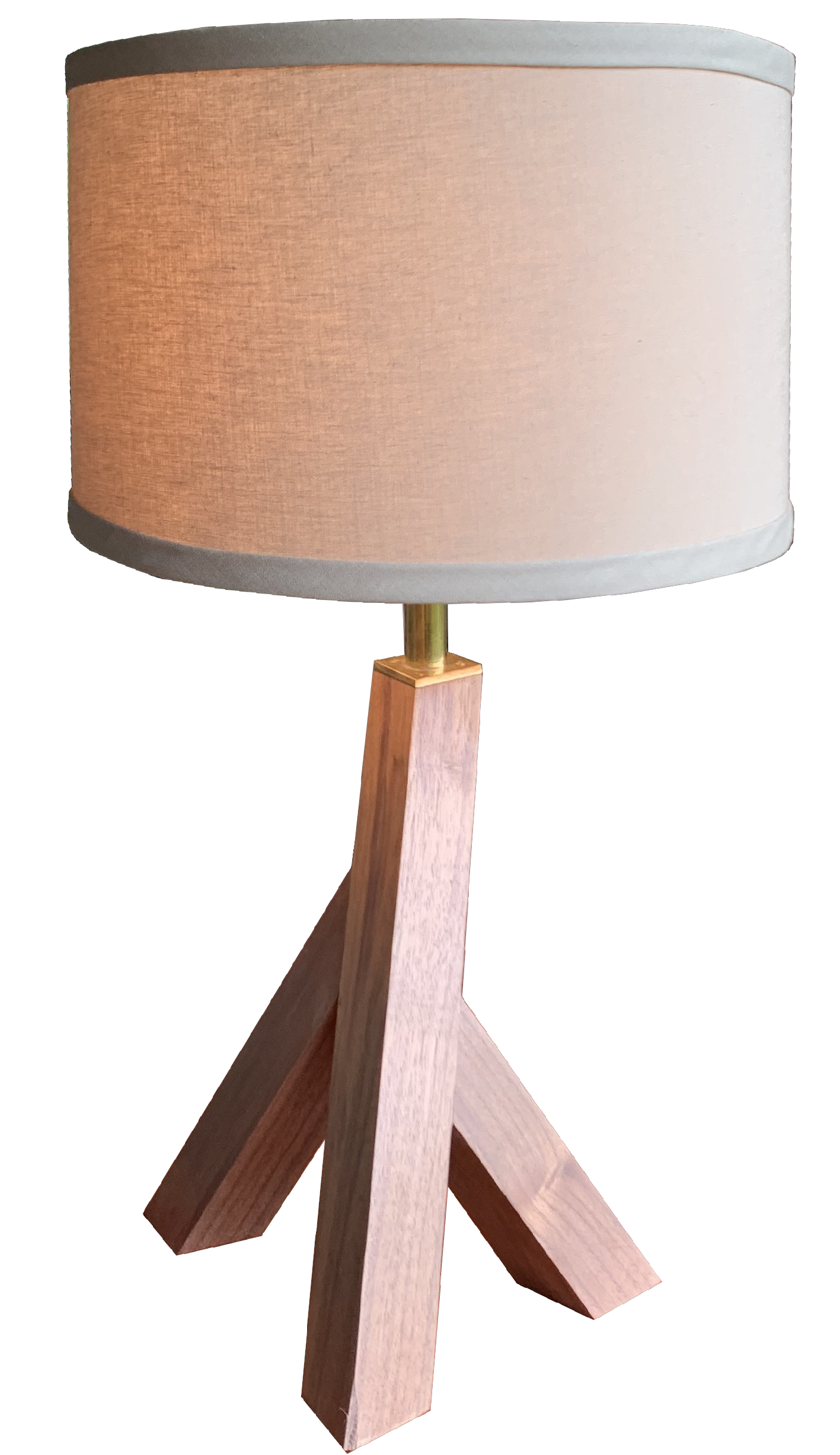 This lamp was designed to look as if it is improbably balanced. This was achieved by moving the focal point of the lamp, the bulb, off center from the base. The unusual balance gives the lamp a jaunty appearance. It’s back is constructed from walnut. The primary leg is cut on a compound angle which means it is angled in two directions. The other two support the lean associated with each angle. Where the wood meets the bulb fitting, I fabricated a brass fixture to ease the transition.
