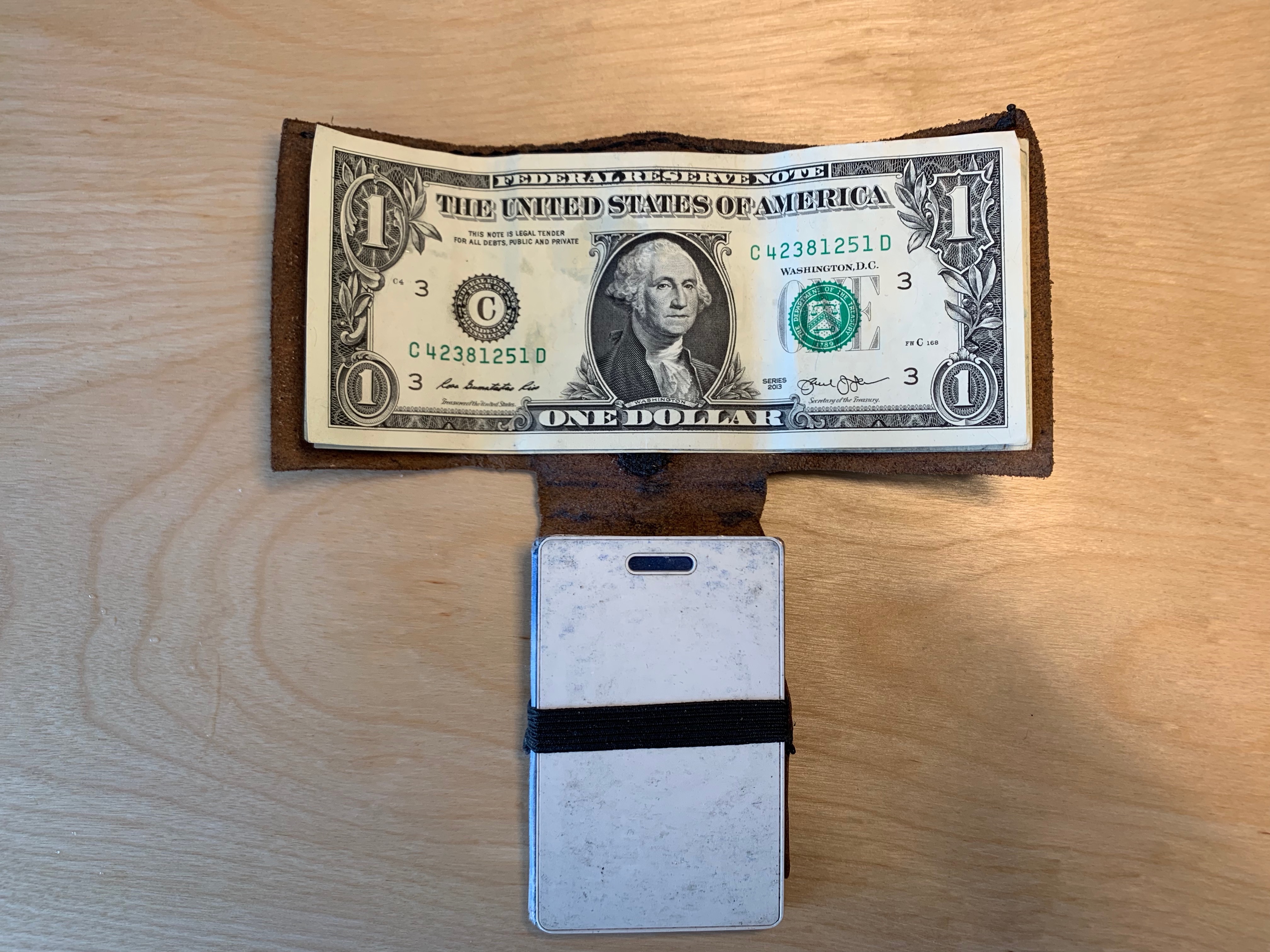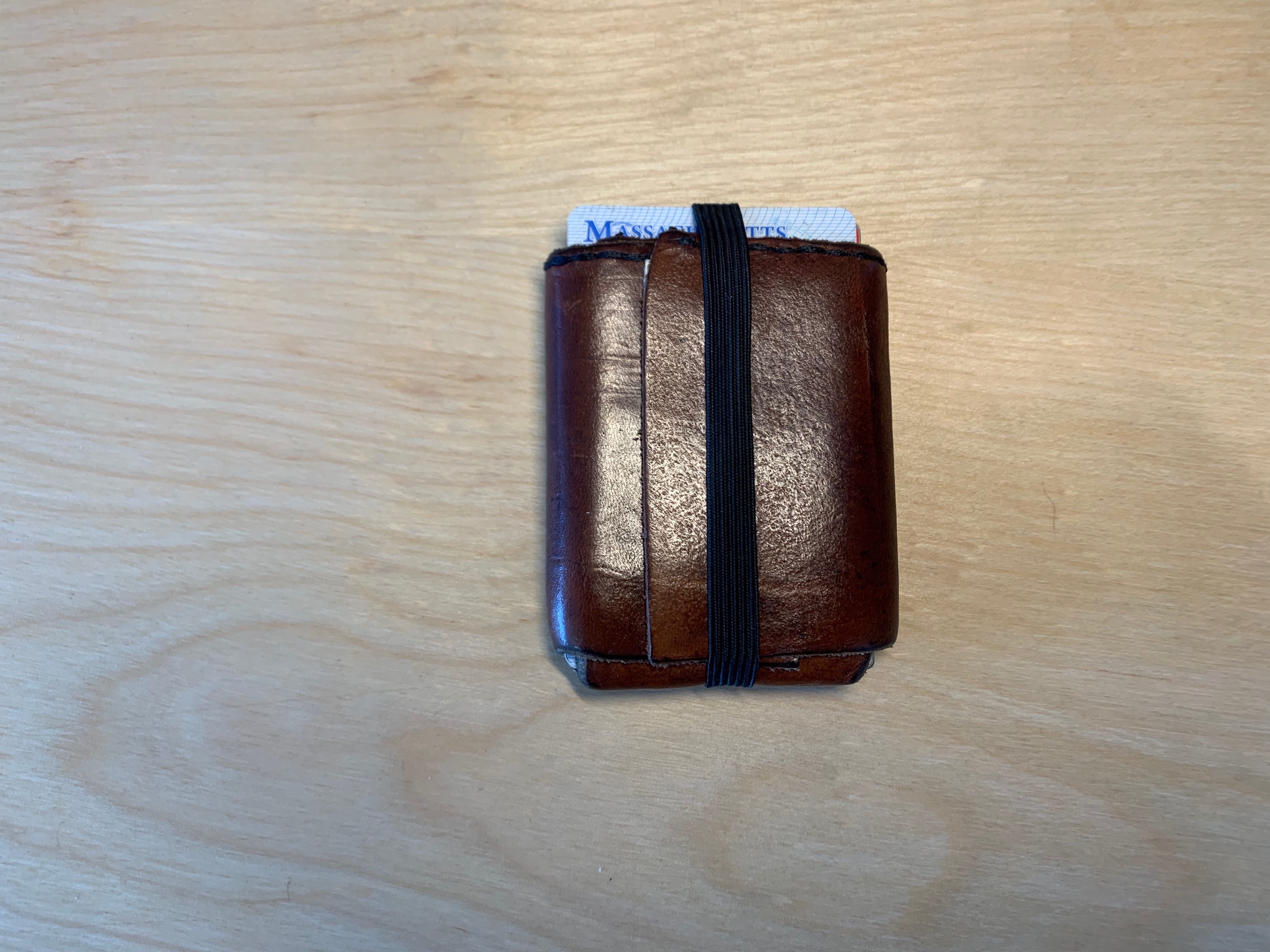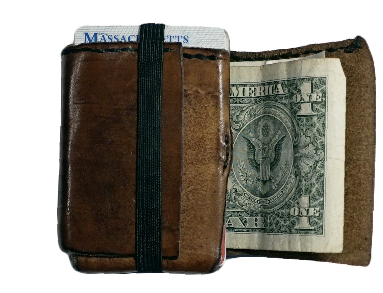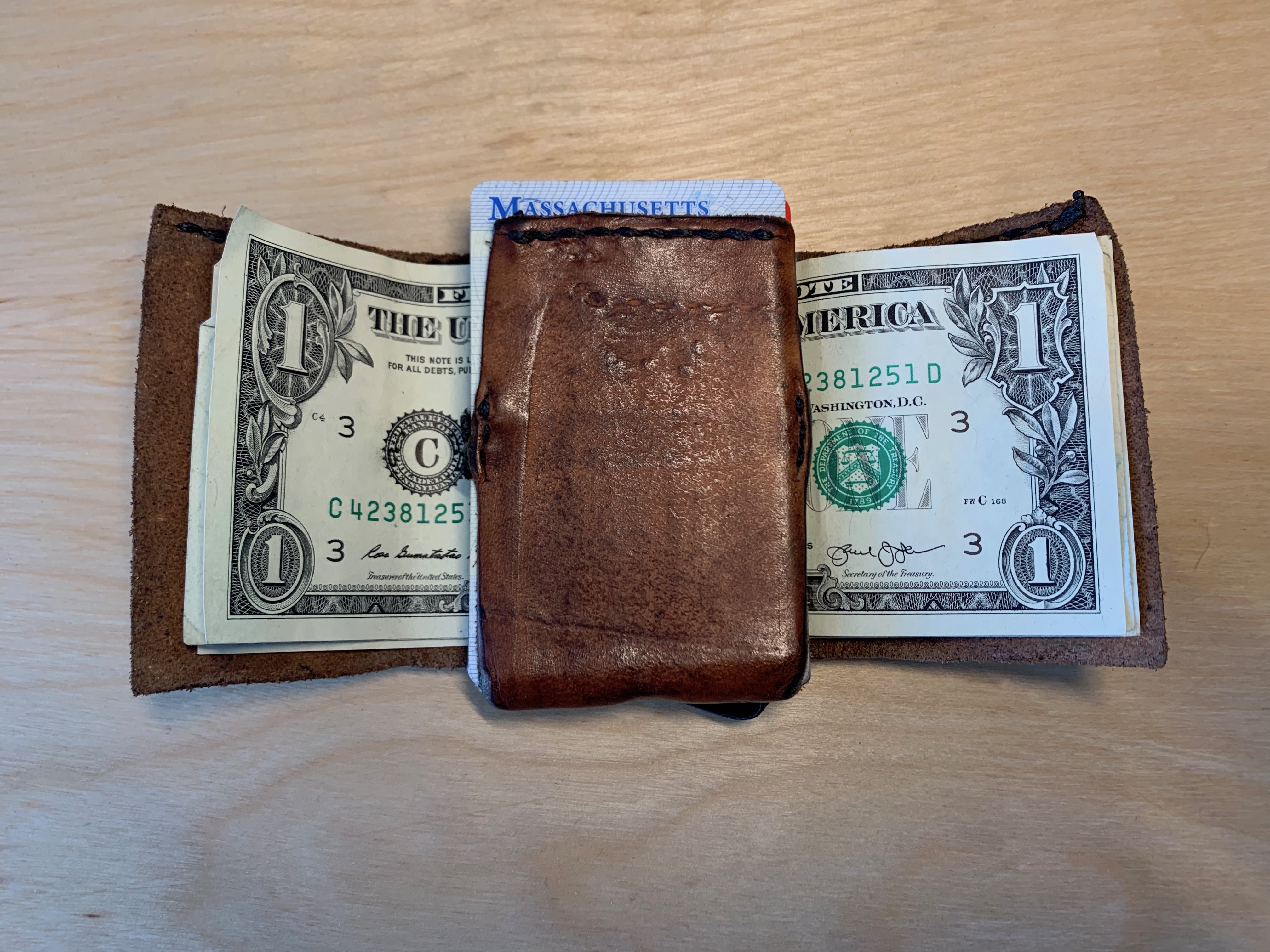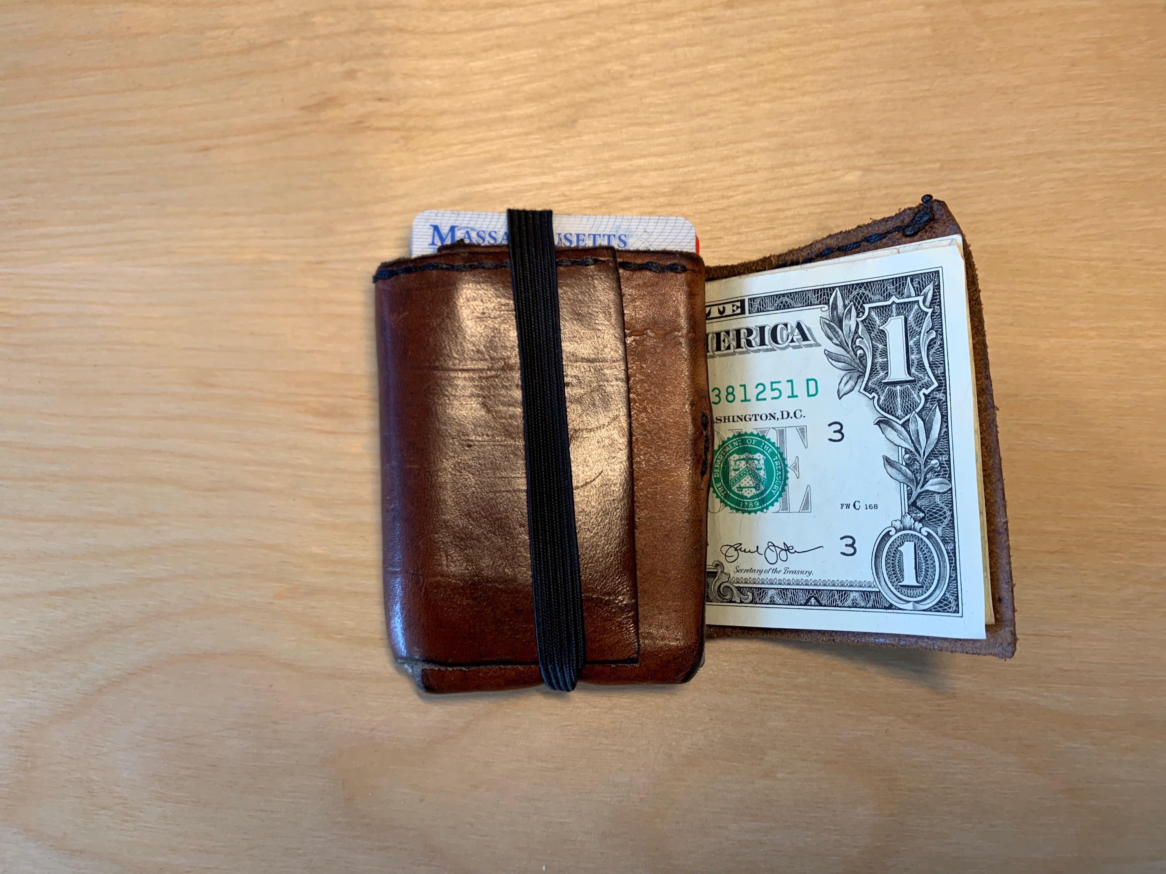 This wallet was one of the first things I made. I am pleased to report they I carry a version of the original around with me today. My goal was a small wallet that could grow to accommodate more on the odd lucrative days. I also wanted quick access to cards since they are regularly used. I began with a series of paper and rubber band prototypes that I would use for a few days and then adjust. I began to test in leather and learned that not all leather is created equal. After much trial and error, I settled on a vegetable tanned leather since it holds its form best. Over a period of a few years, I continued to adjust and refine the design. I learned what stitch is most durable for the elastic and where a stitch is needed to prevent long term deformation and stretching. This most recent iteration has lasted me about three years.
