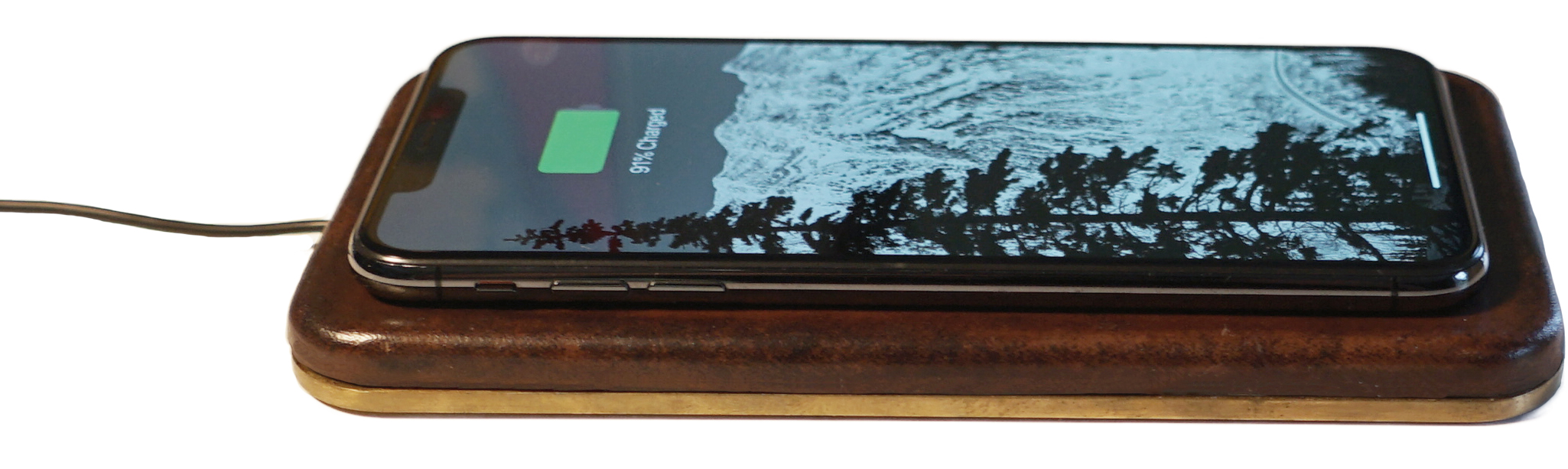 This wireless charger was designed to solve a frustrating problem. While wireless charging is quick and convenient, I would often wake up of find that my phone had vibrated off the charger during the night and had failed to fully charge. I came up with a simple solution: instead of a flat charging surface which allows the phone to slide from side to side, the charger should be more like a dish. When the phone vibrates, it naturally nestles itself in the charger. For materials, I chose leather and brass. The brass has a confidence inspiring weight, and the leather does not scratch the phone. I used a process called hydro-forming to shape the leather. This required two molds which I cut on a CNC machine. I clamped a saturated piece of leather under very high force between the two molds. Once the leather had dried in the form, it held its shape when removed from the form. I then cut a hole in the bottom form for the pre-made charging circuitry and sandwiched the two pieces together. I have been charging my phone on this device for the better part of a year. Every morning I awake to a reliably, fully charged phone.